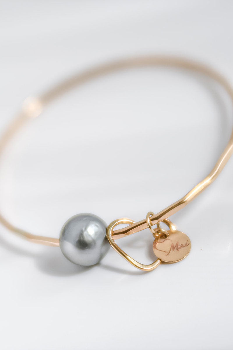 Mai Love Tahitian Pearl Bangle is a timeless piece that exudes elegance and sophistication. Featuring a stunning Tahitian pearl, renowned for its deep, lustrous sheen, this bangle is meticulously crafted with high-quality materials to ensure both durability and style. The pearl is set in a sleek, minimalist design, allowing its natural beauty to take center stage. Perfect for any occasion, this bangle adds a touch of luxury to your jewelry collection and makes a wonderful gift for someone special. Designed to be stacked with the Mai Love Signature and / or Sea Shell Bangles.