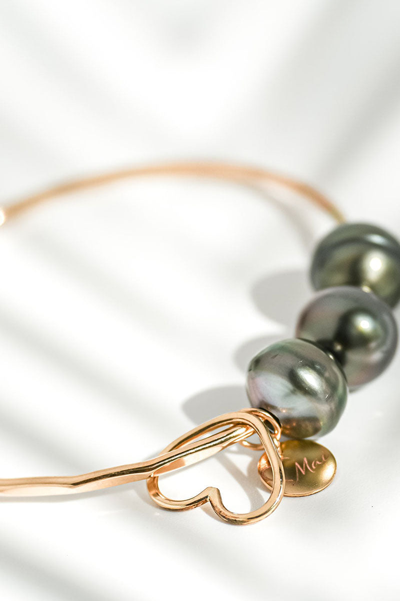 Elevate your elegance with our Triple Tahitian Pearl Goddess Bangle, a stunning piece that embodies sophistication and grace. This exquisite bangle features three lustrous Tahitian pearls, each handpicked for their exceptional quality and unique iridescence. The pearls are hand drilled and set on a sleek, polished and hammered bangle, designed to gracefully encircle your wrist. Crafted from premium materials, the bangle boasts a timeless design that complements both contemporary and classic styles.