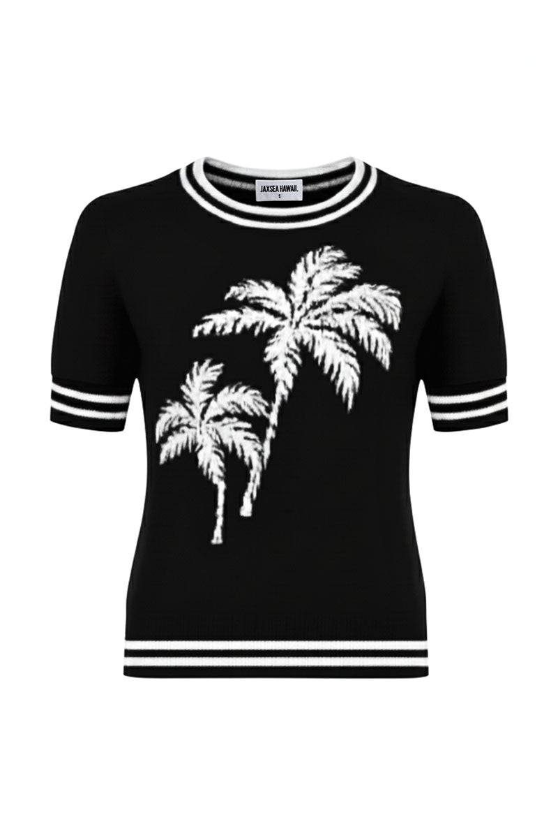 This Kirra Knit Top features a sleek black and white palm pattern, combining comfort with subtle tropical style. Its lightweight knit fabric ensures breathability, making it perfect for everyday wear or layering. The minimalist design offers versatile elegance for any casual occasion.